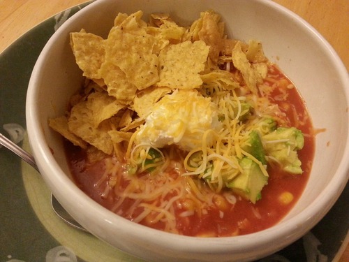 Saute onion & garlic in oil until beginning to soften; then add all other ingredients to pot. Cook in slow-cooker on low 6-8 hours, on stove top 45-60 minutes, or in Instant Pot 15 minutes. Remove and shred chicken and replace in pot. Serve with your favorite toppings (shredded cheese, tortilla chips or strips, a dollop of sour cream, diced avocado, fresh lime juice, and/or cilantro).