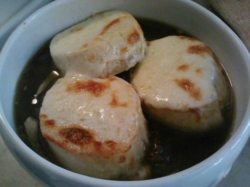 Spoon soup into bowls. Top with a thick slice of French bread covered with cheese, toasted in oven until browned. Can slice bread into chunks or strips if desired.