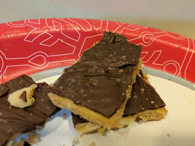 Bake for 5-7 minutes (watch carefully, it will burn quickly). Remove from the oven and sprinkle chocolate chips over the top. Let sit for three or four minutes and then evenly spread melted chocolate over crackers. Sprinkle with chopped nuts.