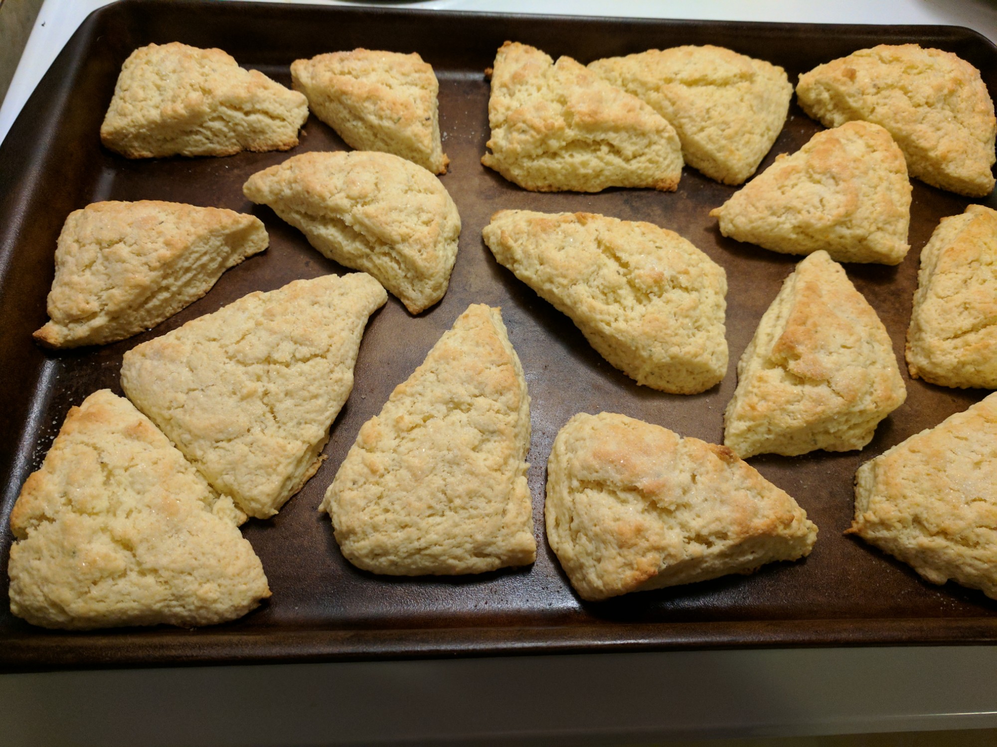 Whisk dry ingredients together. Cut in butter until crumbly consistency. Add wet mixture to dry mixture and stir until just blended. Turn out onto flat surface (add flour if needed) and pat to ¾” thick rectangle; cut into small triangles. Place on baking sheet or stone and sprinkle with sugar. Bake at 375 for 15 min.