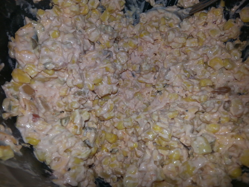 Mix together well all ingredients except corn and cheese. Stir in cheese, then fold in corn and let sit in refrigerator for at least an hour to get “happy.” Serve with sturdy chips (really good with Fritos scoops). Works great with lowfat mayo, sour cream, and/or cheese.