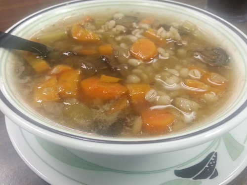 Put all ingredients except barley into large slow cooker and cook on low all day or on high 4-6 hours. Add barley during the final hour or cook ahead and add when serving.