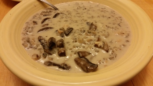 Place water and rice in slow cooker on low with thyme, salt, pepper, and baking soda. Cook until rice is tender (about 4 hours). Saute mushrooms and garlic in butter and soy sauce until browned and reduced by half (about 15 minutes), then add to crock. Deglaze pan with enough broth to loosen brown bits; pour into crock and add remaining broth. When almost ready to serve, make a slurry with cornstarch and enough hot water to dissolve; stir into soup. Add cream and heat to desired temperature; taste and add seasonings as needed. Serve topped with chives if desired.
