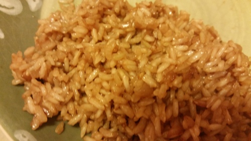 Spray square baking dish with cooking spray. Add rice and soup mix; stir together. Slice butter and lay on top. Boil water and measure 2 ¼ cups exactly; pour into dish, stir and cover with foil. Bake 425 degrees for 1 hour; remove foil and stir before serving.