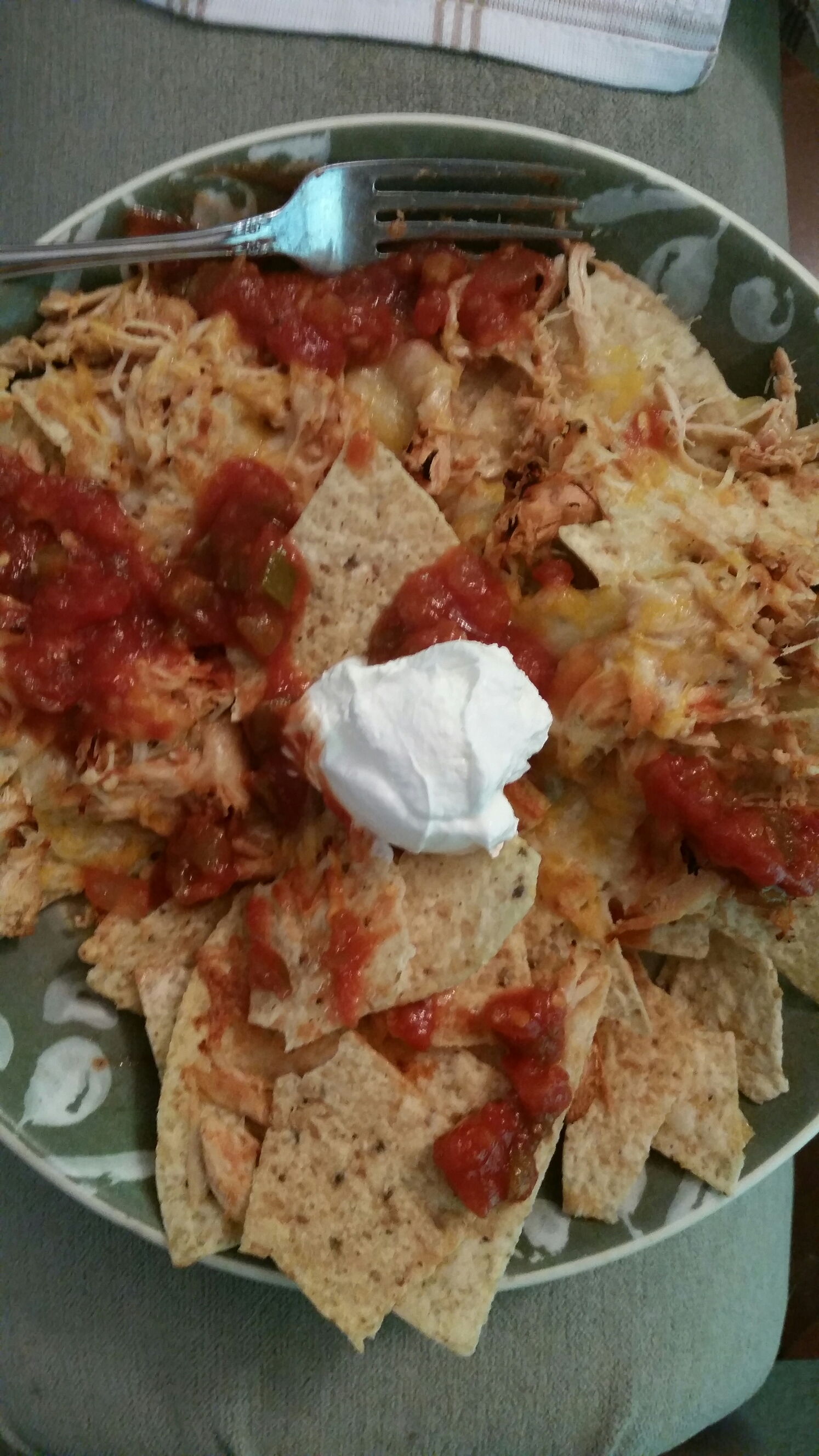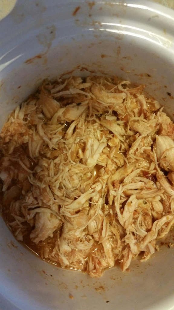 Take about 1 lb boneless chicken (any size pieces). Season with salt and pepper on both sides. Place in slow cooker on low and cover with 8-12 oz your favorite salsa (red or green, store-bought or homemade, doesn’t matter). Cook at least 6 hours, but can go all day. When done, it will practically shred itself.