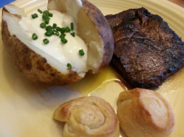 This is my homage to the famous Tennessee Whiskey Steak from the dear departed Town & Country Restaurant here in Chattanooga. The recipe is similar, but not identical. I served this with baked potatoes and salad, both with Town & Country dressings. See my recipe for their squash casserole for more information about the restaurant.