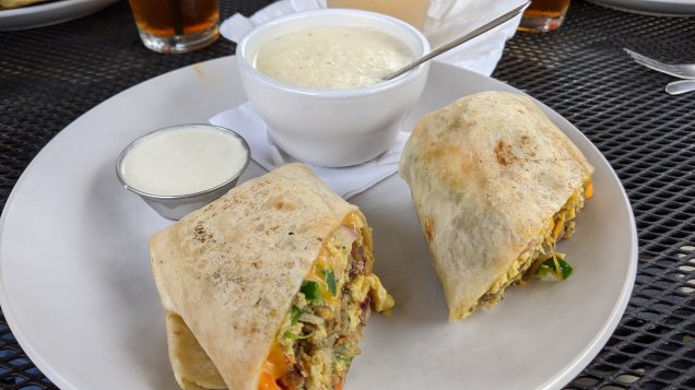 Biscuit with local sausage and eggs and a side of stone ground grits from The Farmer’s Daughter