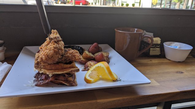 Cinnamon swirl waffles with smoked bacon and fried chicken with blackened potatoes from Stevarino’s