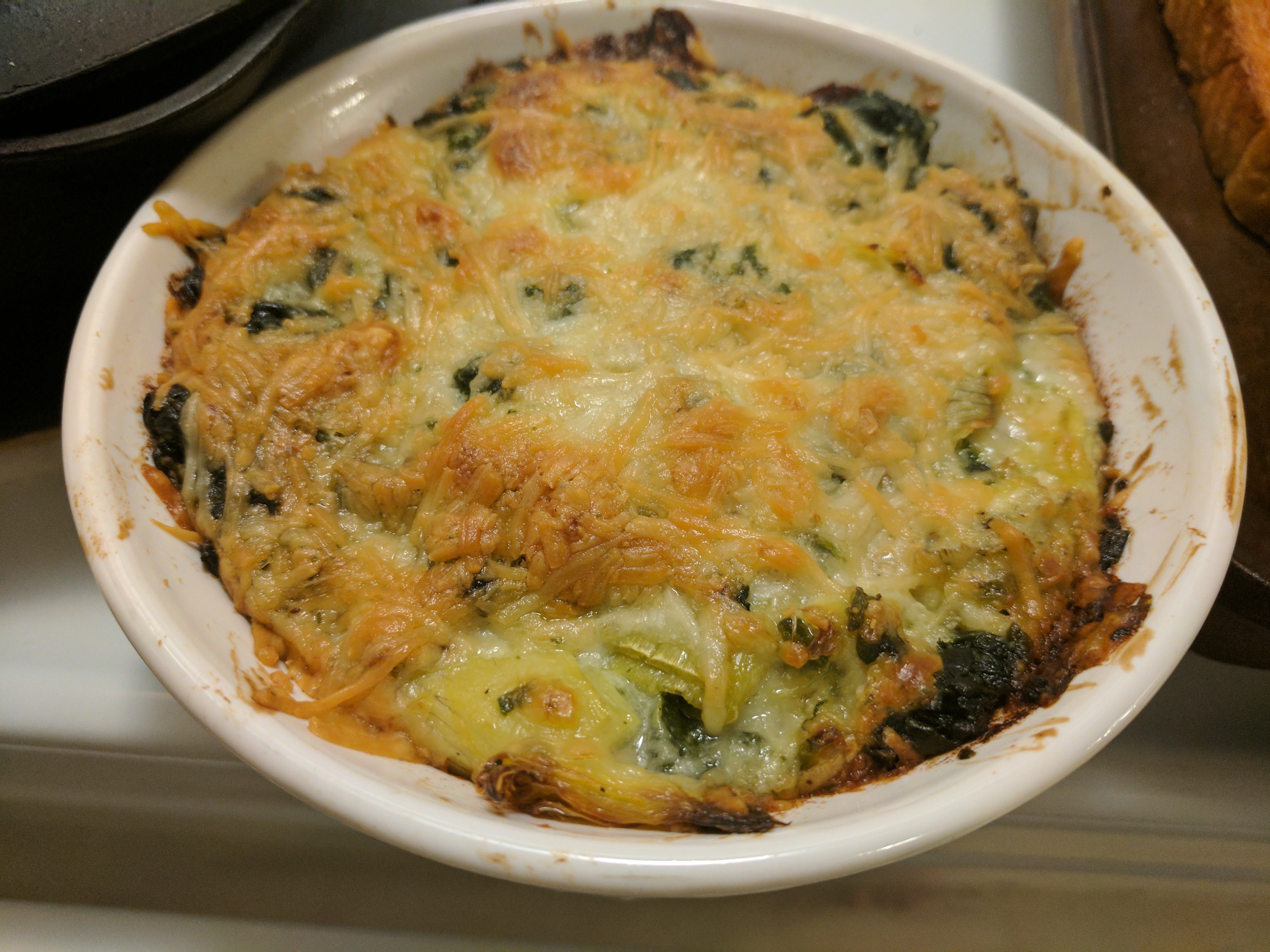 Drain and rinse artichoke hearts and dump into large mixing bowl. Break up with edge of a spoon to desired size. Add spinach (break up in package somewhat if possible, then again with the spoon). Add all other ingredients,* stirring very well, and pour into a sprayed casserole dish. Bake at 400 for 40 minutes. Serve with toasted bread slices, pita chips, or just a spoon.
