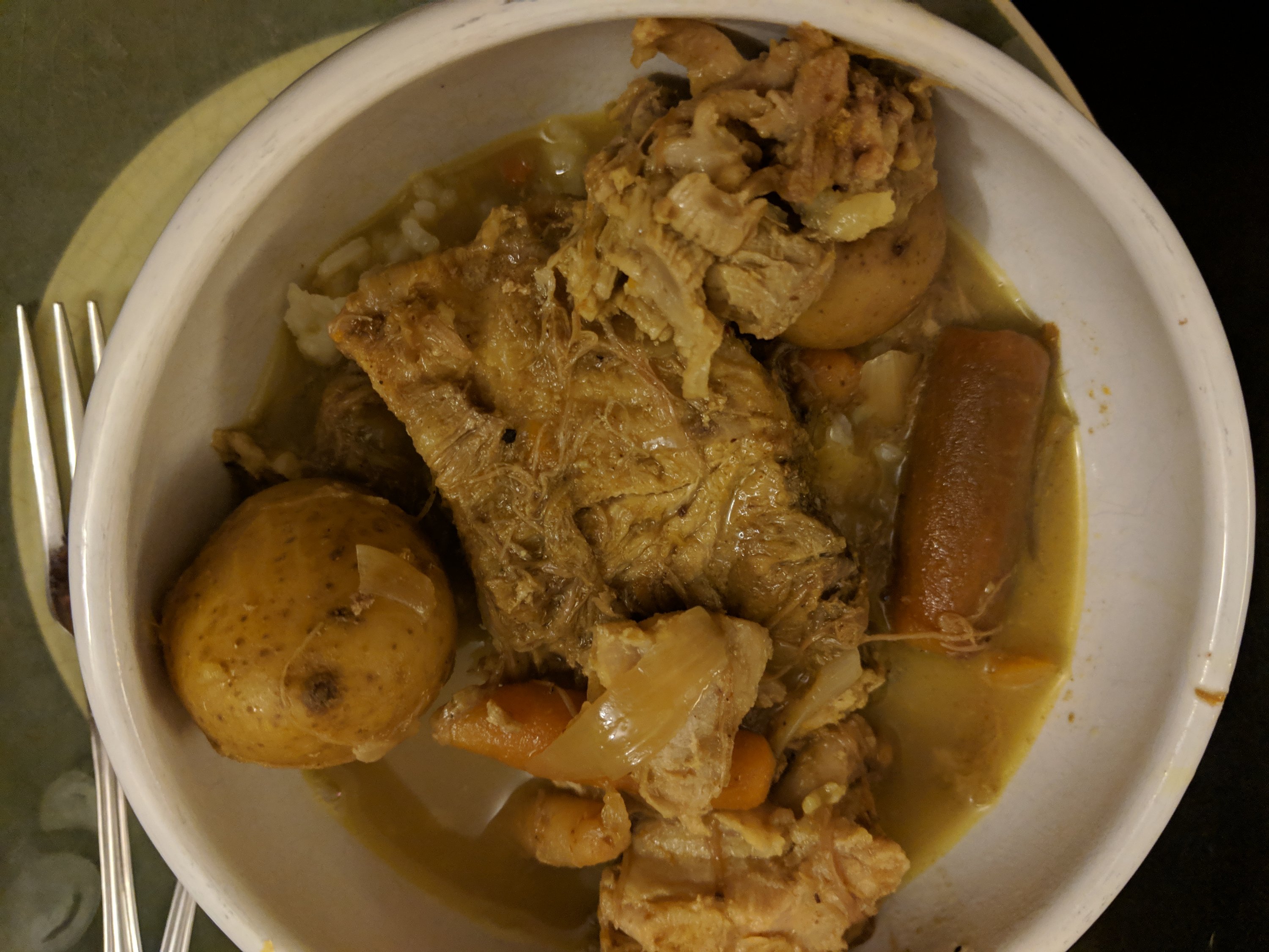 Dry pork roast and place in slow cooker; add all seasonings, then vegetables, then broth. Cook on high 4-6 hours or on low all day. Remove pork, bay leaves, and lemongrass (if applicable); pull meat from bone and place back in pot. Add coconut milk, add seasonings if needed, and serve when heated through.