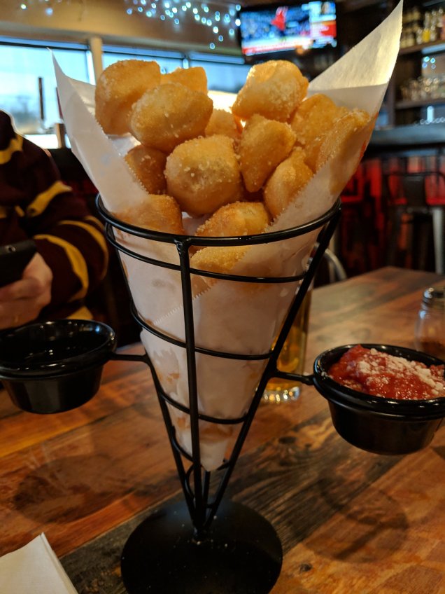 Tonight we had a quick date night at a new pizza restaurant in our favorite part of town. They have a cozy and comfortable dining area, spacious bar, and an awesome special of Pint & Slice for $5. We tried their daily special slice (Spicy Meatball) plus Dough Bois appetizer, and finished with cheesecake. It was all delicioso! (Our 2nd visit, we had the fried ravioli and Philly and pepperoni pizzas, also delicious. Our 3rd visit was Backyard BBQ pizza and blueberry bread….both sinfully yummy!)