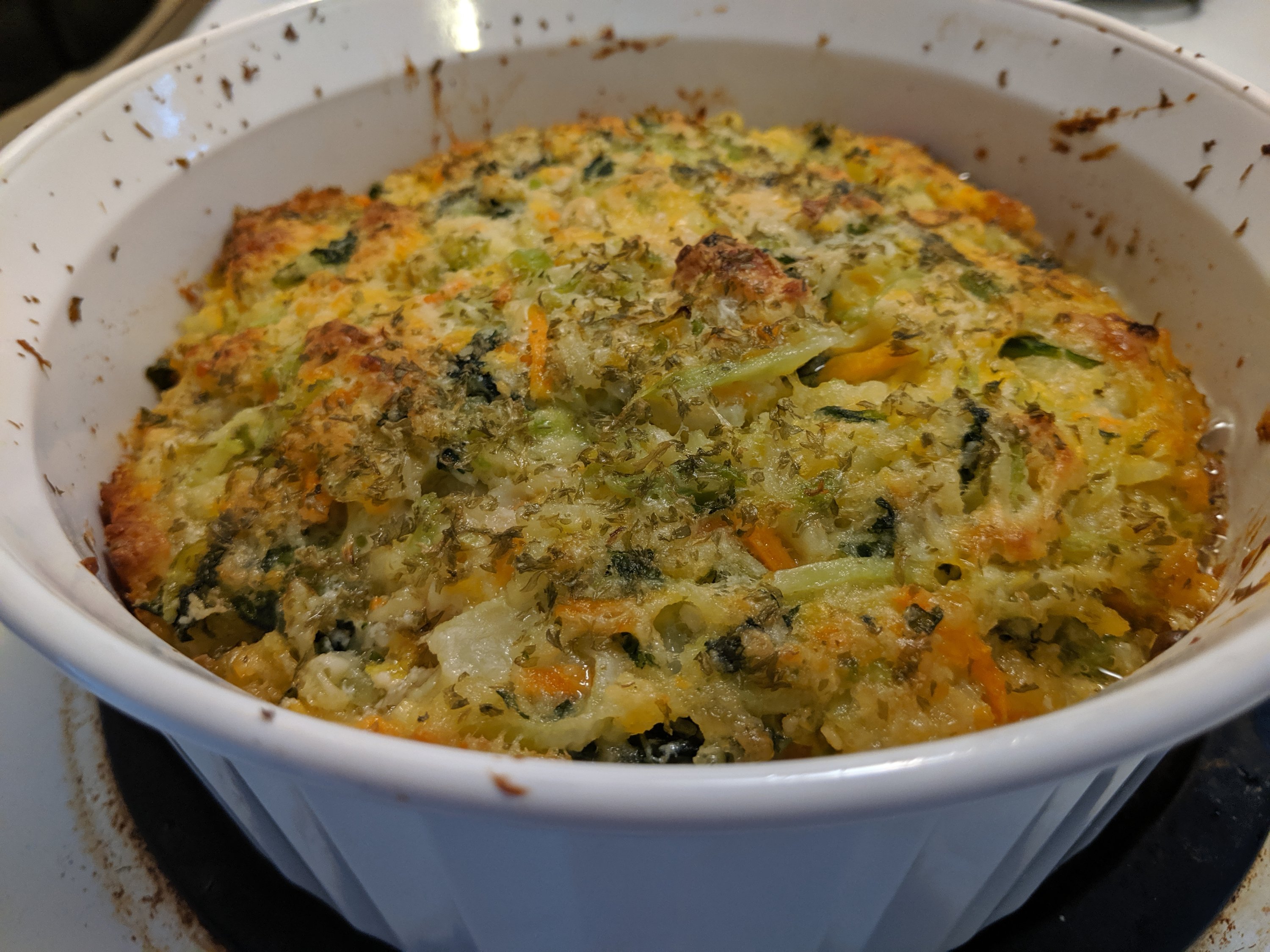 Steam slaw on stove top or microwave until softened. In the meantime, beat eggs in large bowl and stir in cheese, onion, garlic, salt and pepper; add drained slaw once ready and stir to combine. Pour in baking dish that has been coated with cooking spray and sprinkle herbs over top if desired. Melt butter in same dish used to steam slaw and pour evenly over top. Bake at 350 until golden, 30 to 40 minutes.