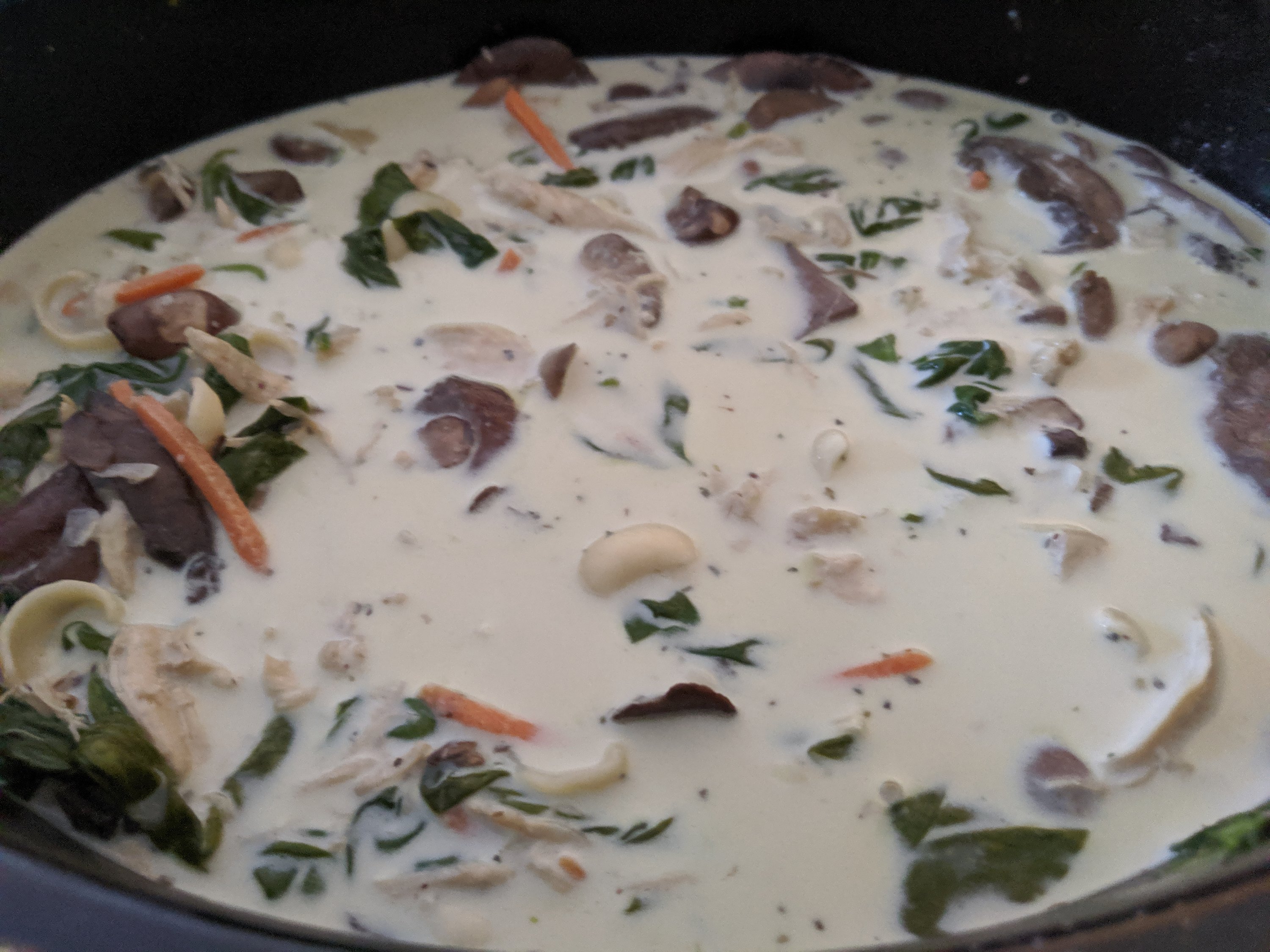 Add all ingredients except spinach, cream, pasta, and cheese to large slow cooker. Cook on low 6-8 hours or high 3-4 hours. Remove chicken to plate, add pasta and spinach, stir and replace cover. Shred chicken and add back to pot. When ready to serve, stir in cheese and cream. Taste and add seasonings or Marsala as desired.