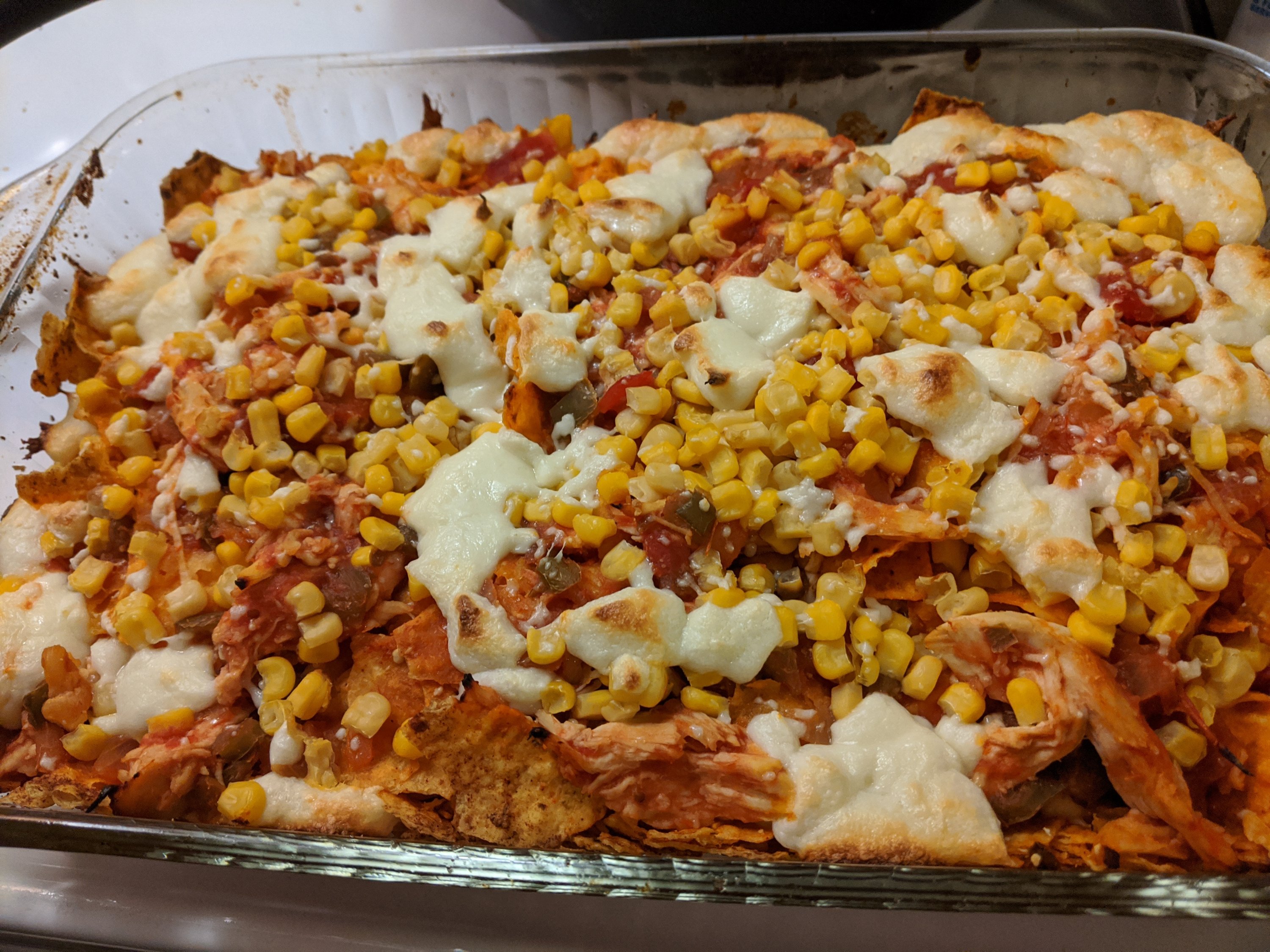 This recipe is very forgiving and adaptable. Want more chips? More meat? Less cheese? Prefer beans to corn? Want it spicier? Change the amounts and ingredients to suit your tastes. [And you can, of course, use plain tortilla chips if you prefer. But why would you want to do that?]