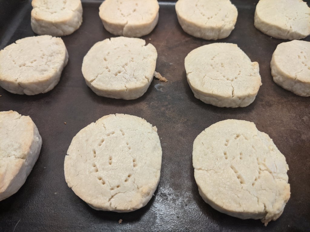 For cylinders, slice into 1/2″ rounds and arrange on baking sheet. For flats, split sides of bag and place dough on baking sheet, pierce (or roll pattern) on top and score into rectangles. Bake 375 degrees 10-12 minutes until edges are beginning to brown, but not the top. Remove to rack and allow to cool completely.