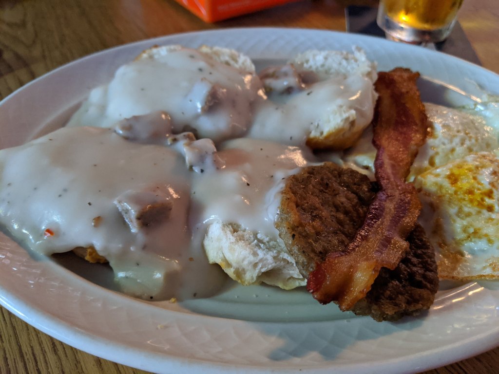 We started a new tradition a several years ago of going out for an early meal on or near New Year’s Eve, then staying home for the evening; neither of us enjoys crowds, late nights, or loud noises for prolonged periods. This year, with the new year beginning midweek, we opted to go for brunch on the Sunday before at a rather unusual spot: a biker bar on the road to our church that recently began serving brunch. We enjoyed our meal, the unique atmosphere, and the friendly service. We’ll be back soon!
