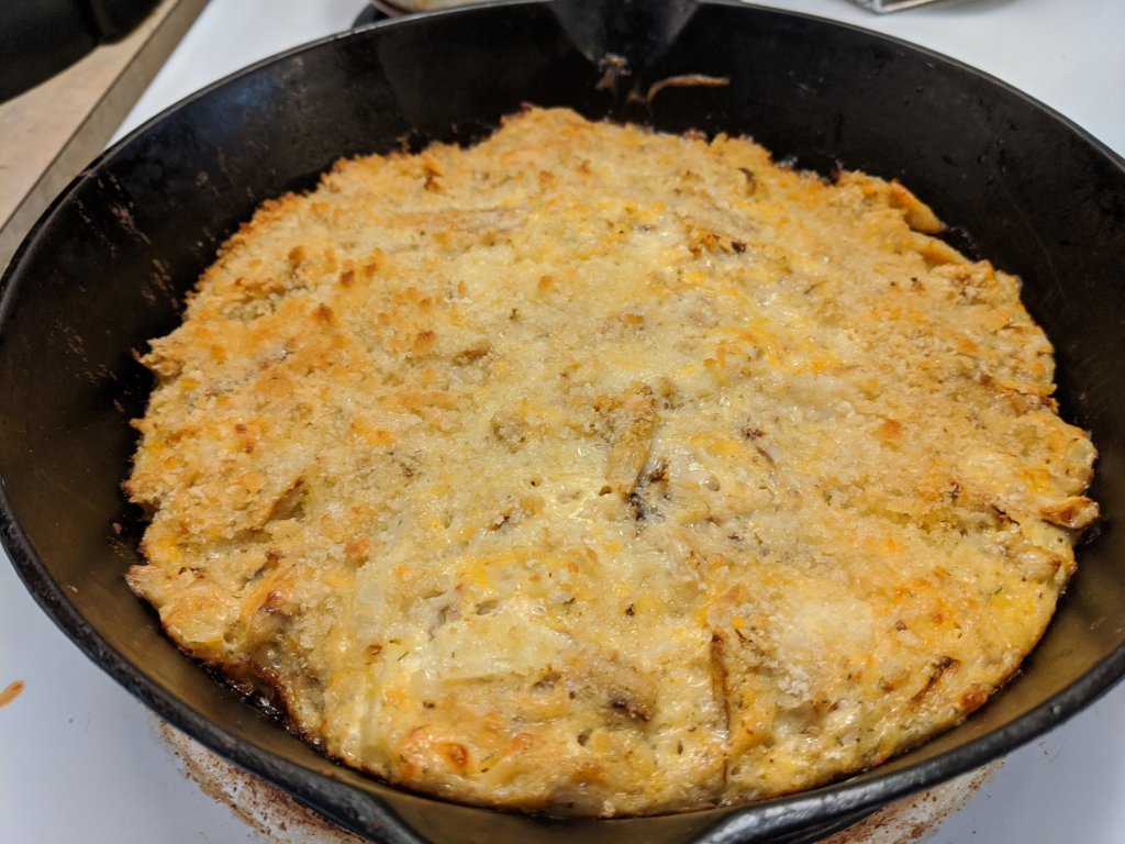 Combine mayonnaise, cheese, onion, egg and seasonings; stir in crab very gently (this can be done up to a day ahead and covered and refrigerated). Spoon into single dish or skillet, or individual ramekins. Sprinkle panko [and parsley] over top and drizzle with butter. Bake uncovered at 400 degrees for 20 minutes or until top is light golden brown. Allow to sit for 5-10 minutes before serving. Goes well with rice, pasta, crackers, or other starchy accompaniment; serves 2-3 (double or triple recipe for larger groups).