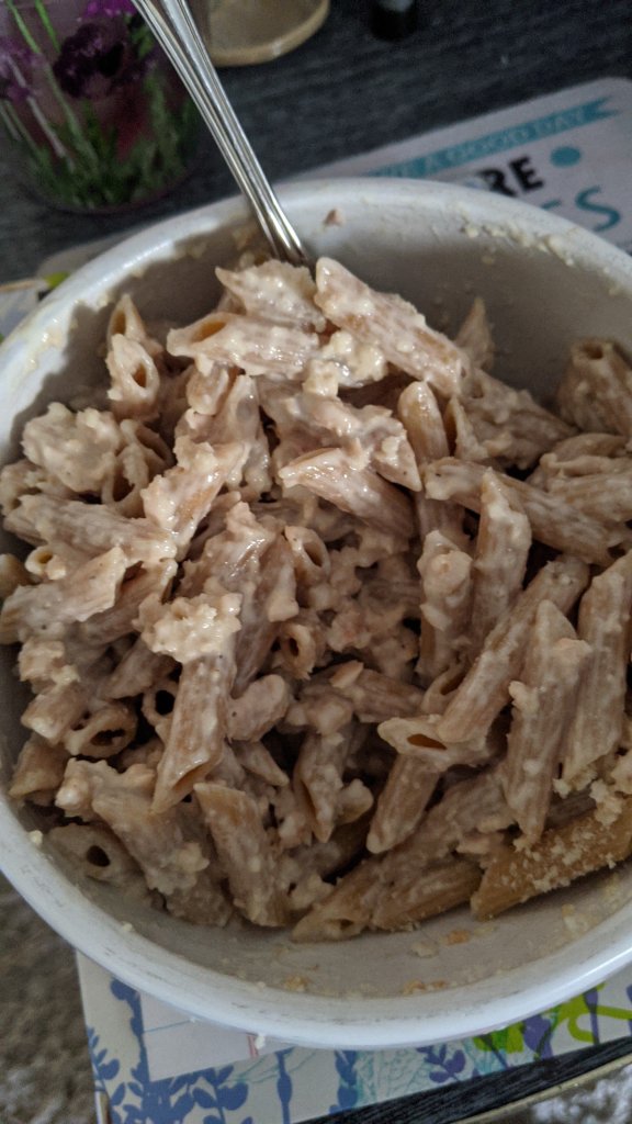 Prepare all 3 parts ahead of time. When ready to serve, take desired amount of pasta, add desired amount of dressing, and top with desired amount of topping. Stir well and enjoy. (If preparing for a group, use all of each, of course. This recipe makes 3 lunches for the 2 of us, or 6 servings total.)