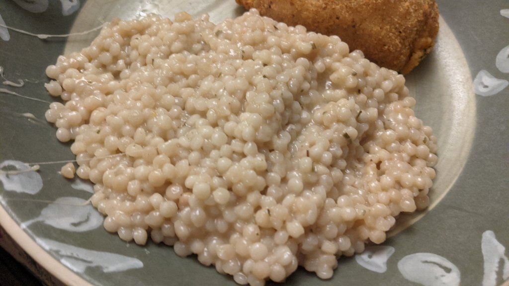 We had bought it in the box before and it was okay [similar to Kraft Dinner, the couscous is small and grainy and you add a flavored powder], and I used Israeli couscous in soup once; but this was the first time using “the good kind” as a side dish. It makes all the difference!