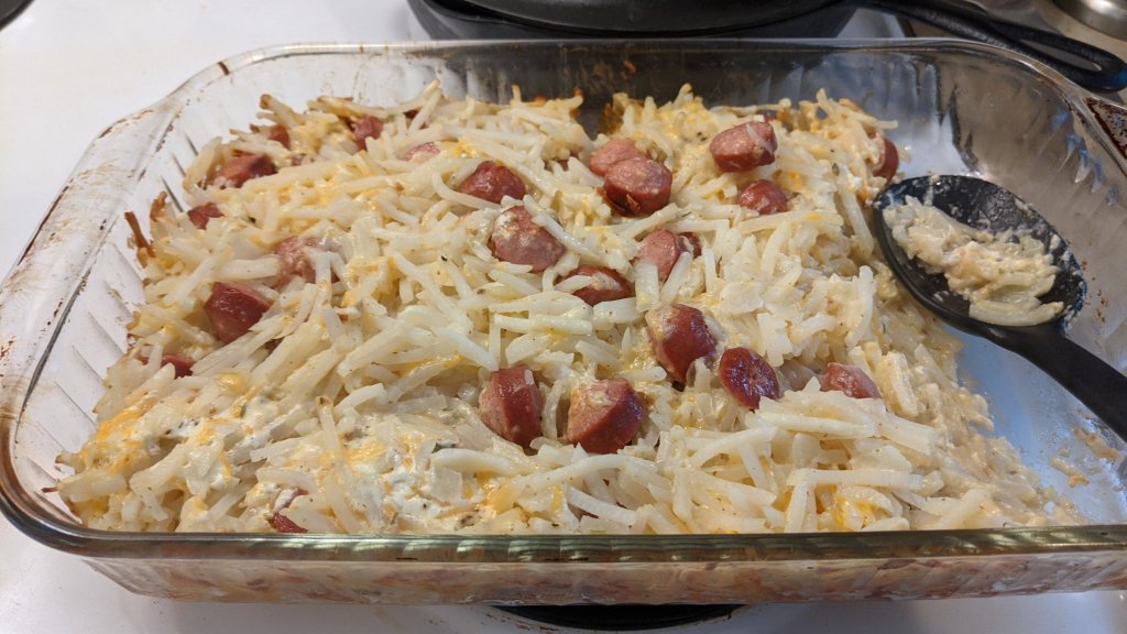 Defrost and drain hash browns. Meanwhile, slice hot dogs into 1/2” coins. Stir together all other ingredients in large bowl, then add sliced hot dogs, then hash browns, stirring each time until incorporated well. Spray oblong or 2 small casserole dish(es) and pack mixture lightly. Cover with foil and bake 375⁰ for 45 minutes. (Would go great with some soft crescent rolls).