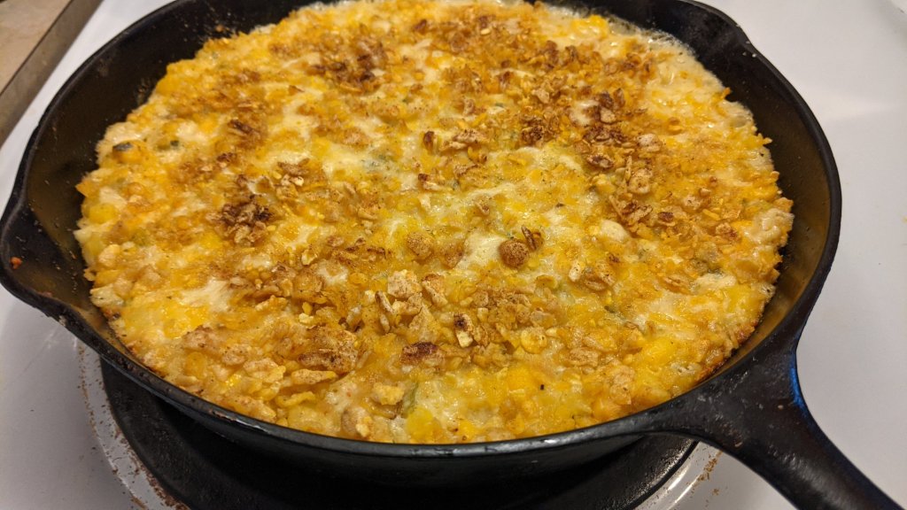 Drain hominy and pour into large bowl; add all other ingredients except chips. Spoon into sprayed or buttered casserole dish or skillet and top with crushed chips if desired. Bake at 350⁰ for 30 minutes or until golden and bubbly on top.