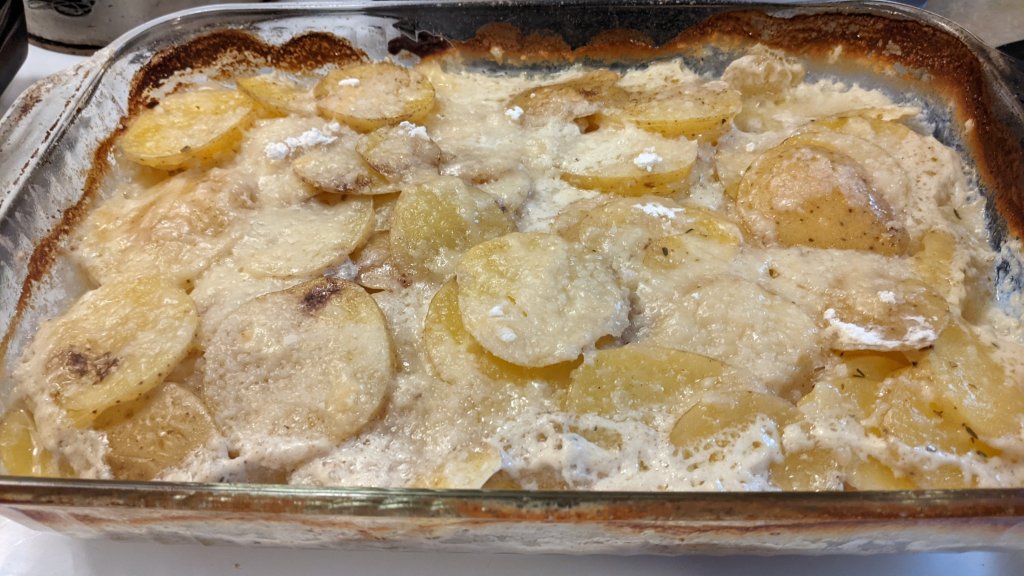 Slice potatoes as thin as possible, no more than 1/4″ (a mandolin works very well for this). Melt butter and stir in milk or half-and-half. Layer half of potatoes in bottom of prepared baking dish and sprinkle with half of flour and seasonings, then half of cheese, then half of butter/milk. Top with remaining potatoes, remaining flour and seasonings, remaining butter/milk, and top with remaining cheese. Cover with foil and bake 30 minutes at 375; uncover and bake until top is browned and bubbly and knife inserted goes to bottom of dish easily. Allow to sit 15 minutes for sauce to cool and thicken.