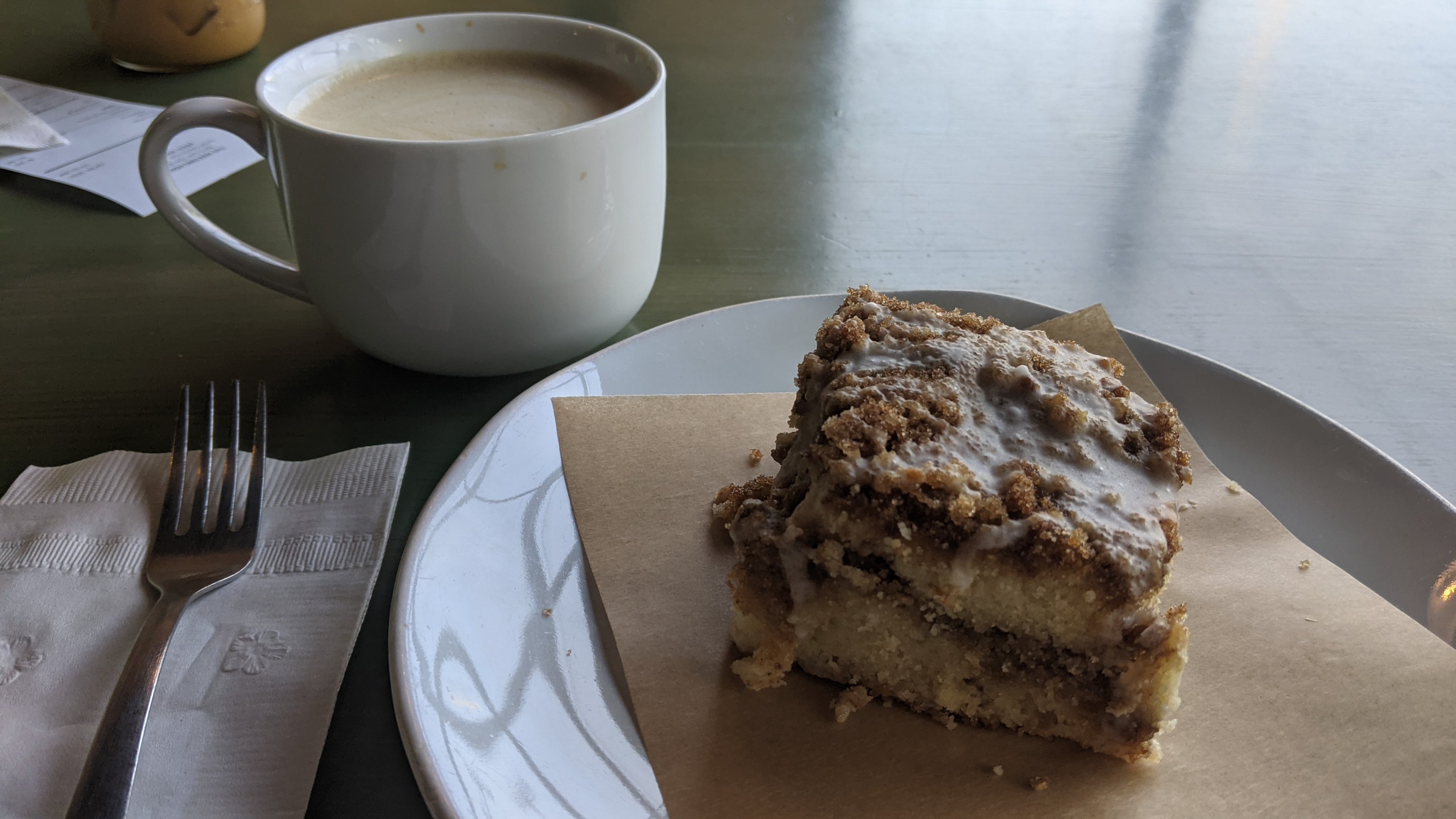 Today, my friend Jamie and I met up for coffee and relaxing conversation at a local coffee house called The Meeting House. This multipurpose space serves as a church on Sundays, a meeting space for groups, and a spacious place to hang out for as long as you wish (people were working, studying, talking, eating, drinking, and smiling). I had a white chocolate oat milk latte and a hunk of moist coffee cake. Hubby and I have been here several times (including a couple of visits to the church) and it’s always a pleasant place. If you’re ever in Chattanooga, check it out!