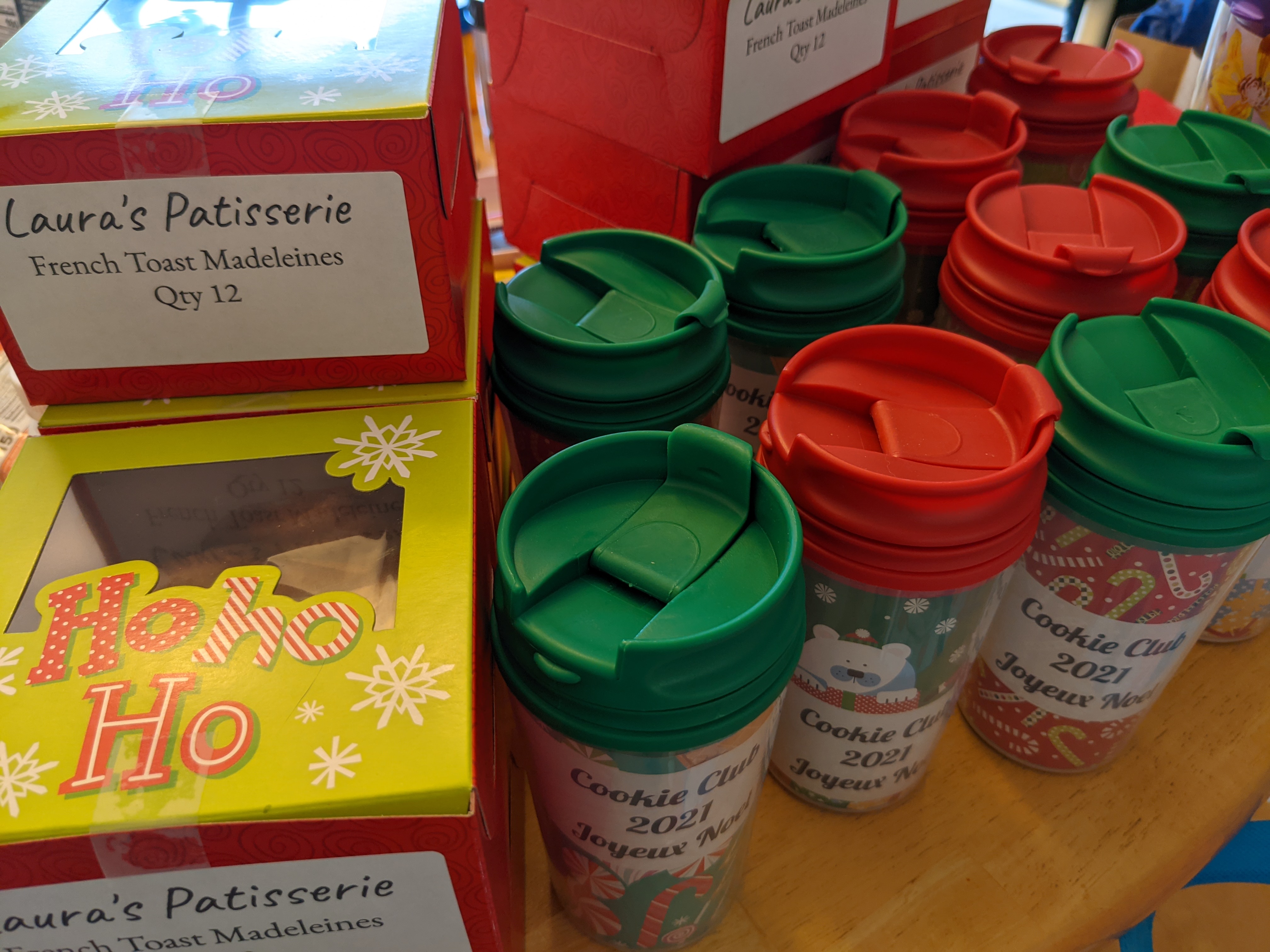 This was my 2021 offering for my annual Cookie Club, the theme of which was Joyeux Noel. I first tested the recipe for our Jour de la Bastille dinner in July and perfected them before their official December debut. Madeleines are little cakes rather than cookies, although the French word for cookies (petit gateaux) literally means “little cakes.” They are especially good with coffee, so I packaged them in pastry shop boxes and included a coffee tumbler with French roast K-cup inside.