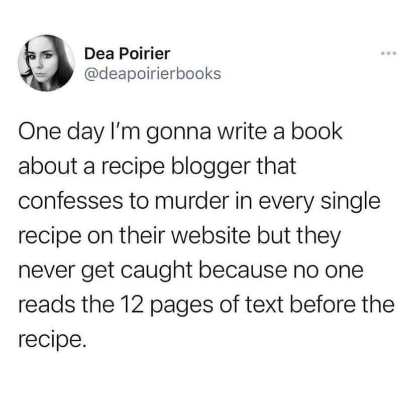 Recipe Blog Dark Humor January 12, 2022Laura B Share this: Click to share on X (Opens in new window) X Click to share on Facebook (Opens in new window) Facebook Like Loading... Related