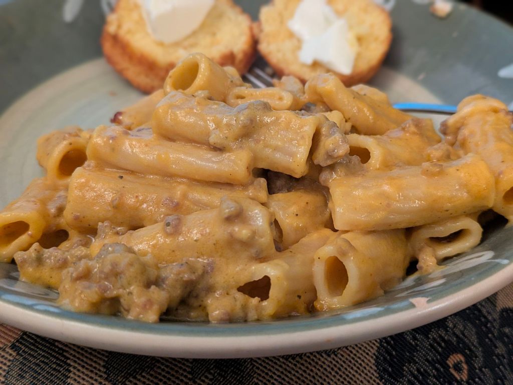Brown sausage and add shallot or onion and garlic, stirring until softened. Add broth and stir until no brown bits are on bottom of pan, then add seasonings and pumpkin, and heat until bubbling. Reduce heat to medium, add noodles, and stir. Cook until noodles are al dente (5 minutes if using Instant Pot). Stir in cream/milk and top with Parmesan cheese if desired.