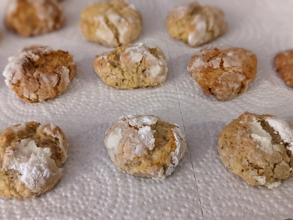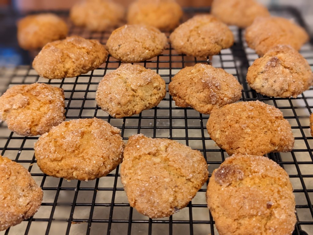 Pour remaining sugar in a small bowl. Form dough into rustic 1″ balls, roll or dip in sugar, and place on greased baking sheet or seasoned baking stone. Bake at 350 11-13 minutes, until golden. Remove to wire rack to cool completely. Makes 8-10 dozen.