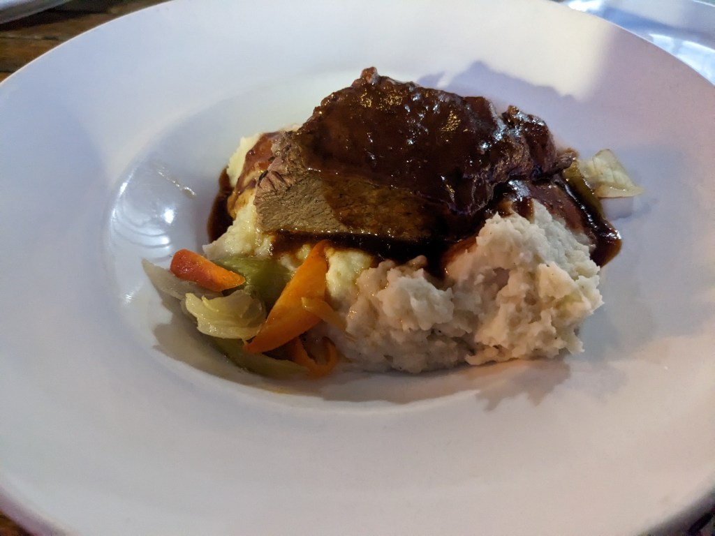 On Friday night after work, we went to the small mall downtown to The Public House for dinner and to see the lights nearby. My favorite dish there is the red wine braised pot roast; it’s so moist and flavorful and just falls apart when your fork touches it. I decided it was time to create my own version! Instead of the mashed potatoes they serve it atop at the restaurant, I opted to cook Yukon Gold potatoes and carrots with the roast; but you can omit these and serve the roast with whatever side dishes you choose. We had enough to last most of Christmas week, allowing us time to finish getting ready for the holiday weekend.