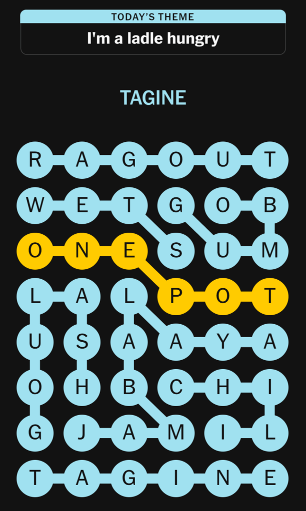 And Today’s Theme Is…. October 13, 2025Laura B Well played, NYT Strands. I aced this one 🍲 Share this: Click to share on X (Opens in new window) X Click to share on Facebook (Opens in new window) Facebook Like Loading... Related