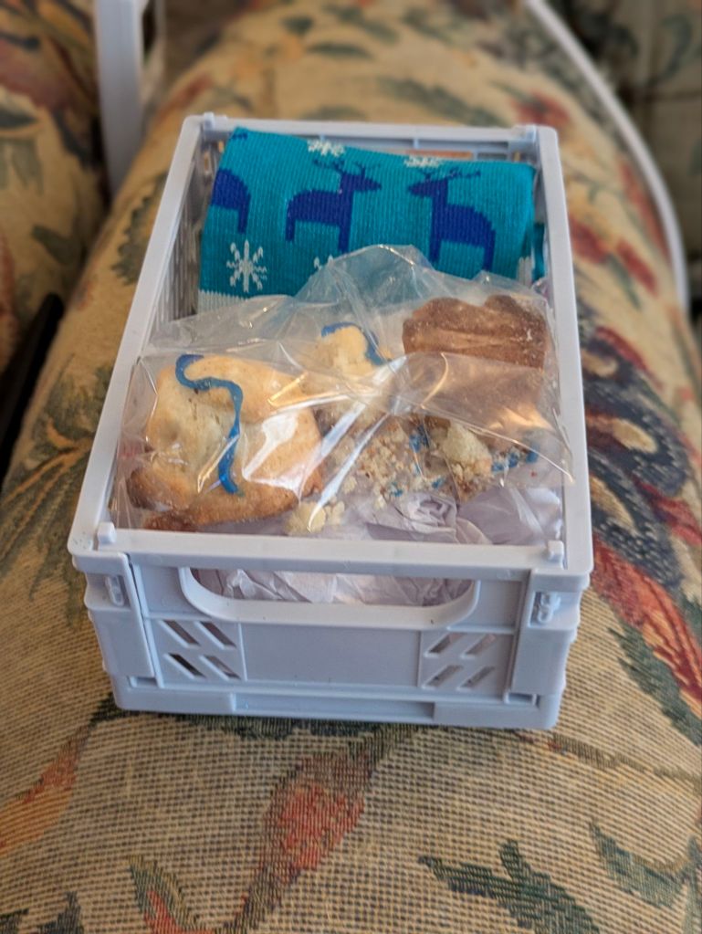 This was my offering for Cookie Club 2025; the theme was “Rooms of the House” and I chose the laundry room (so the cookies are decorated to look like laundry pods). I packaged them in small collapsible “laundry baskets” and included a pair of Christmas socks!