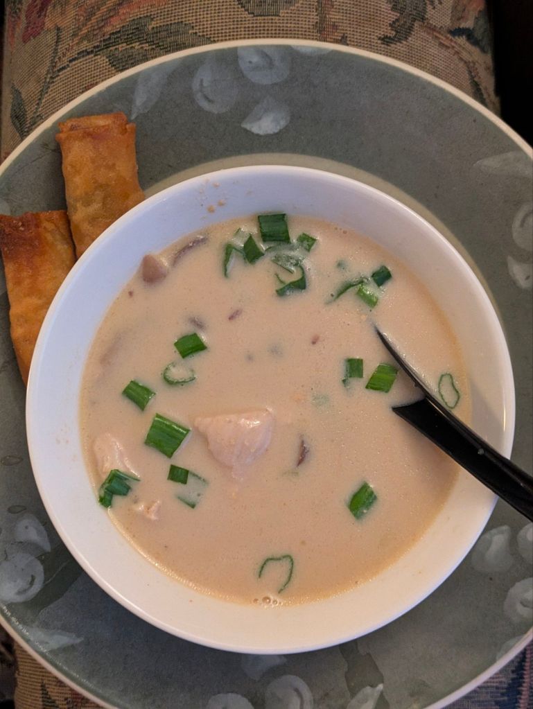 *A little background on Tom Kha Gai Thai soup — Tom means soup, Kha means galangal and gai means chicken; so Tom Kha Gai means “chicken galangal soup.” You can certainly substitute ginger for the galangal or another protein for the chicken, but it won’t be Tom Kha Gai! [If you aren’t fortunate enough to have an Asian market nearby, sliced galangal and lemongrass paste are both available with next-day delivery from Walmart.]