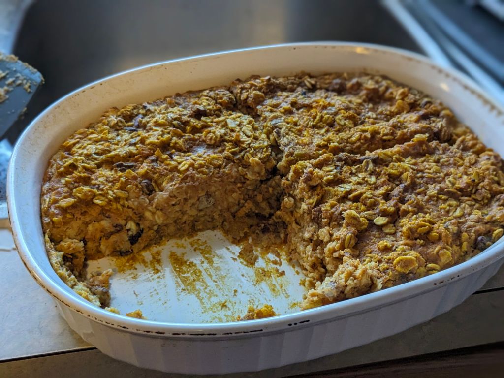 Stir together first 7 ingredients until fully incorporated. Fold in oats, then gently fold in pecans. Pour or spoon into well-greased pan or dish and bake at 350⁰ for 35-45 minutes. Cool 10 minutes, slice, and serve.
