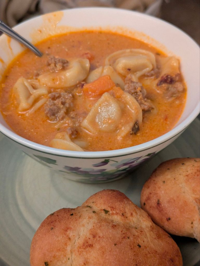 Brown sausage, then add onion and seasonings and stir. Add broth and scrape bottom of pot until all bits are incorporated, then add tomatoes and tortellini. Heat until tortellini floats to the top; turn off heat, stir in cream cheese, and add a splash of milk. Serve topped with Parmesan if desired.