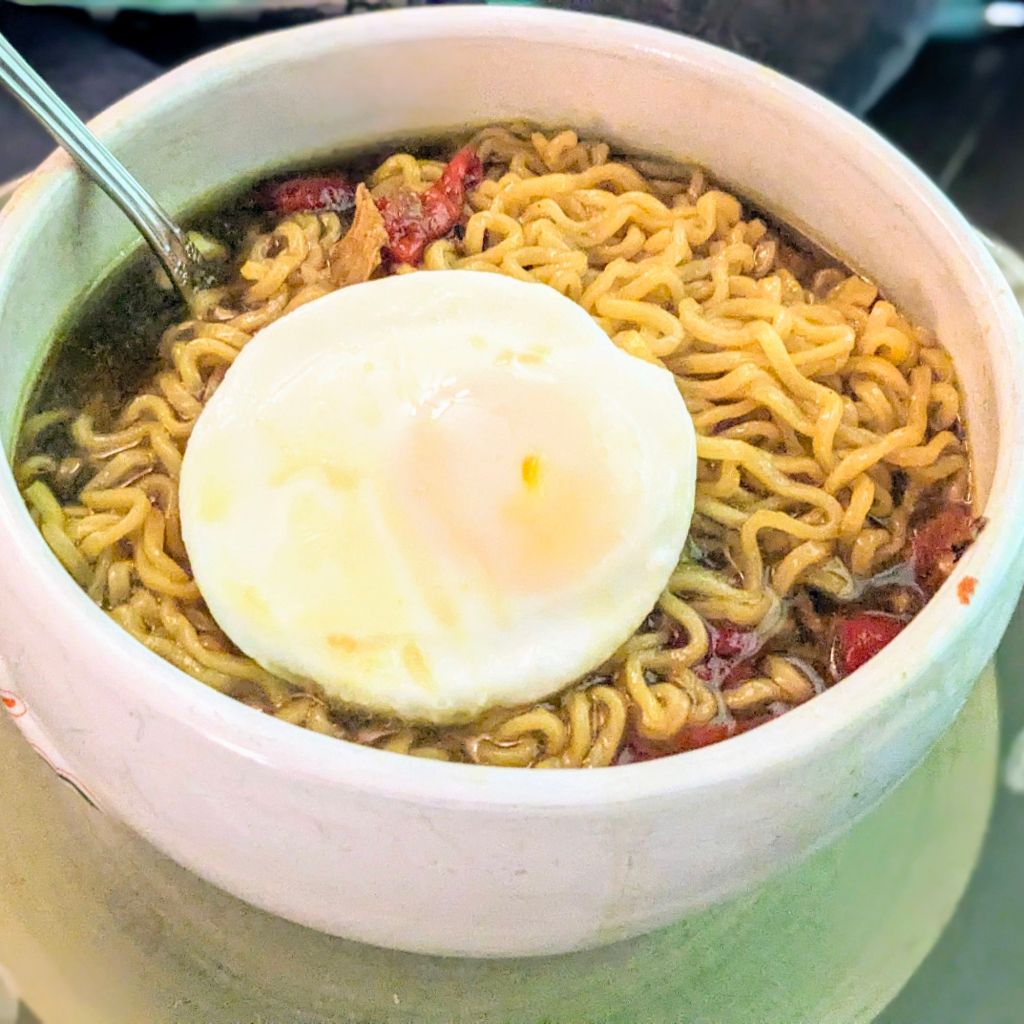 Place pork in single layer in pressure cooker and drizzle with oil. Sear on both sides on Saute mode. Cancel and add all other ingredients except noodles and eggs. Pressure cook for 20 minutes and allow natural release for 10 minutes. Cancel, remove pork, and add noodles; pressure cook for 3 minutes and do instant release. Place pork in bottom of each bowl, add noodles, ladle over broth, and top with egg, scallions, and sesame seeds.
