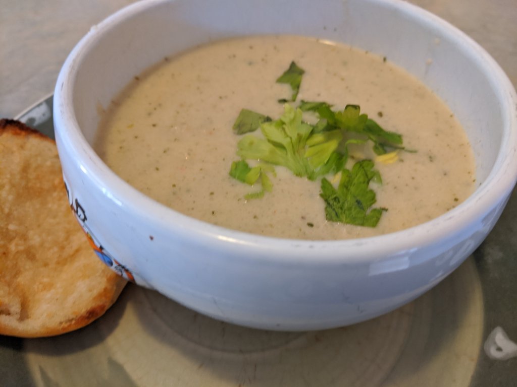 This recipe was inspired by the Caribbean Shrimp Chowder at our favorite Mexican restaurant (which now seems to have disappeared from the menu). I wanted to see how it would taste with crab and cauliflower instead of the shrimp and potatoes, and blended into a bisque. I’m happy to report it was muy delicioso!